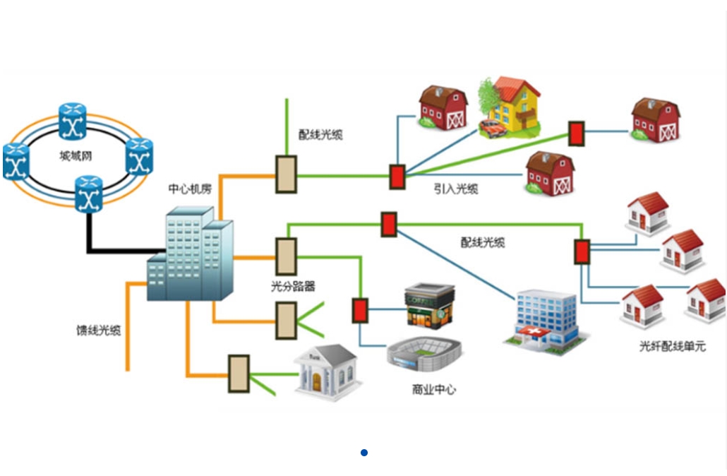 包括:光缆、光纤配线单元(ODF/FDU)、光分路器配线箱(SDC)、光分路器及光纤跳线、FTTH用皮线光缆及终端用户适用的面板盒等。