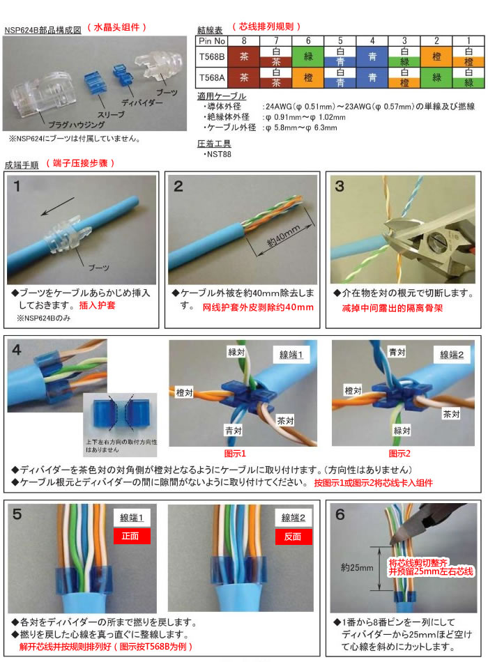 以多件式水晶头(NSP624B)为例,按T568B规范指导网线的端接图文指导。按标准压接,提高端接网络跳线的性能和压接成功率,让网络跳线的制作标准化,确保网络的稳定高效。